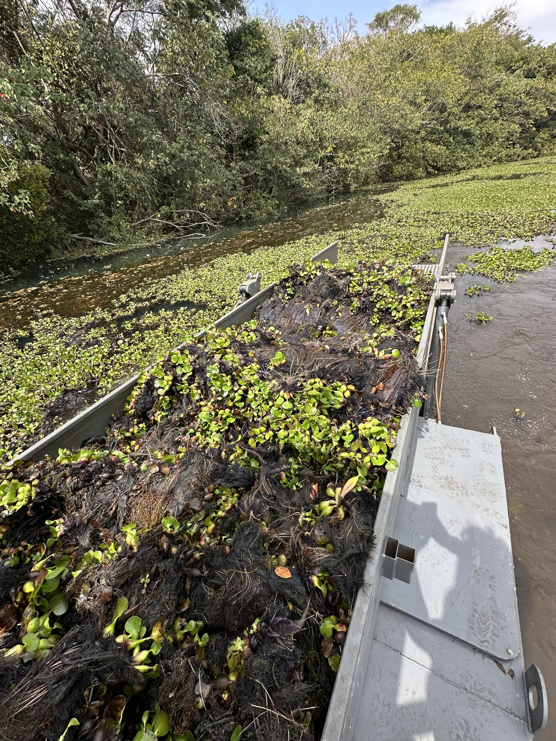 A esteira frontal permite recolher as macrófitas – plantas aquáticas e lixo flutuantes destinando-as a esteira central